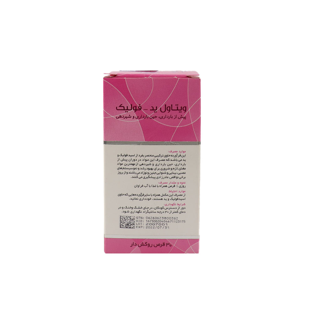 | مزایا | این فرآورده حاوی ترکیبی منحصر بفرد از اسید فولیک و ید می باشد که مصرف این مواد در دوران پیش از بارداری, حین بارداری و شیردهی از مهمترین مواد مغذی لازم و ضروری برای بهبود رشد و نمو سیستم های عصبی, بینایی و شنوایی جنین و نوزاد می باشند و از بروز برخی نواقص مادرزادی پیشگیری می کنند. |
