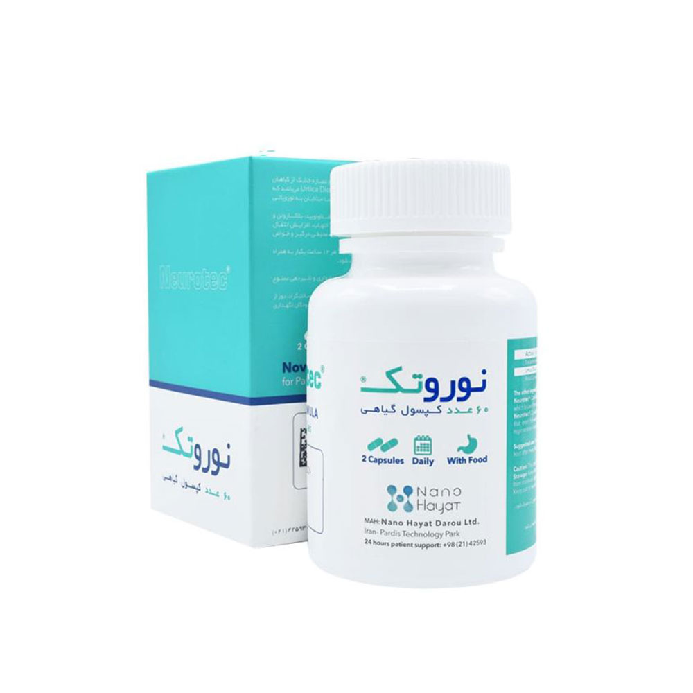 | سایر ویژگی ها | کپسول نوروتک حاوی آسکوروبیک اسید, فلاونوئید, بتا کاروتن کلروژنیک اسید می باشد که از طریق کاهش التهاب, افزایش انتقال سیگنال های عصبی, تقویت ترمیم و بازسازی اعصاب محیطی درگیر و خواص آنتی اکسیدانی عمل می کند. |